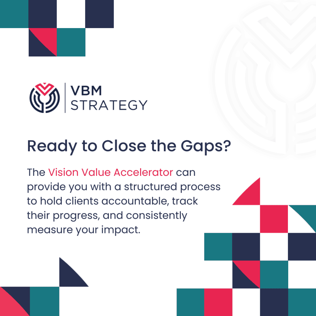 Solution: Track key performance indicators (KPIs) related to client progress, satisfaction, and goal completion. Systems like our Vision Value Accelerator program can provide frameworks to help measure these metrics, validating your results and showcasing your value.